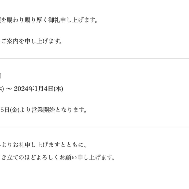 平素は格別のご愛顧を賜わり賜り厚く御礼申し上げます。 年末年始の休業日のご案内を…
